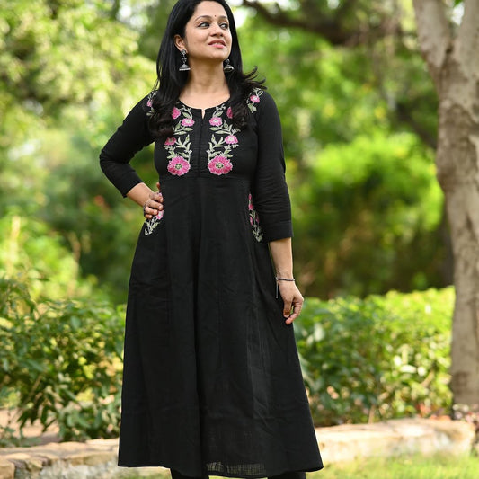 Shyamli Black Cotton Anarkali Kurta Pant Set with Thread Embroidery