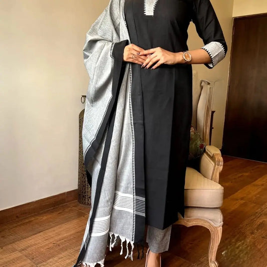 Ahalya Hand Embroidered Cotton Kurti Pant Set with Dupatta