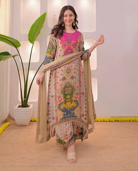 Chandramukhi Double-Shade Mirror Work Anarkali Round Plaza Set