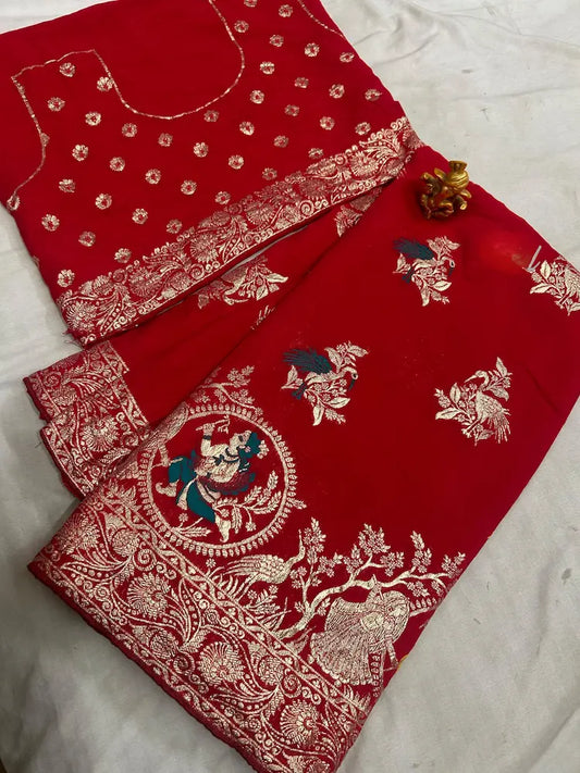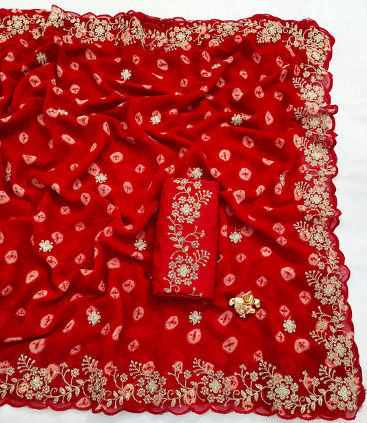 Maabetii Red Georgette Hand Pita Work Saree with Running Blouse