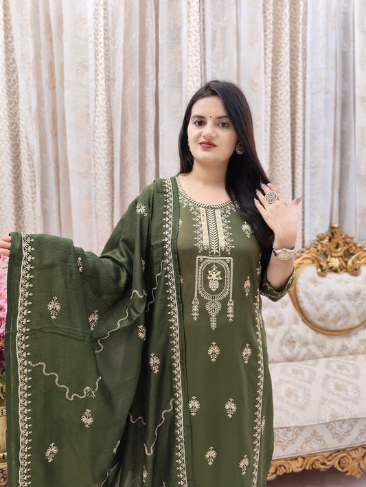 Maabetii Green Rayon Heavy Embroidery Straight Suit Set