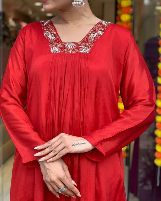 Maabetii Red Cotton Embroidery and Adda Work Alia Cut Suit Set